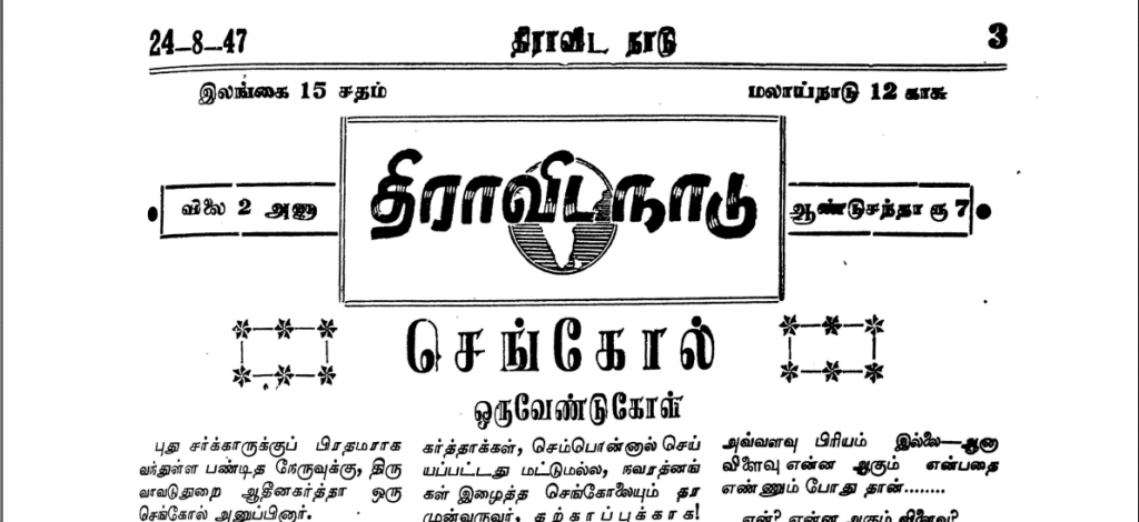 The original article in Dravida Nadu, titled "Sengol: Oru Vendugol" (Sengol: A Request). Photo: V. Geetha