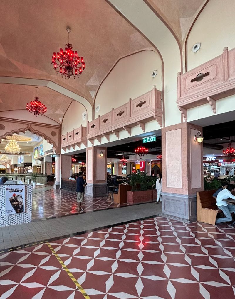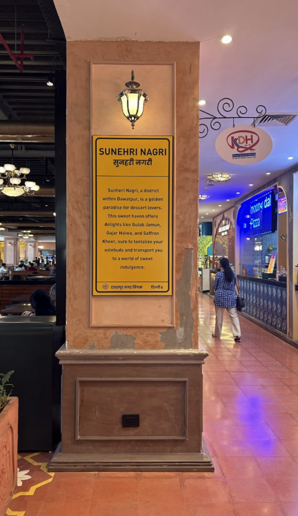 However, the most intriguing aspect of the mall is the food court, which Omaxe Chowk labels Dawatpur, which has been divided into four distinct areas where different shops have been clubbed together: Sunehri Nagri, Laal Bagh, Neel Nagar, and Pannapuri. Each distinct area is decorated in a specific theme and the stores are curated accordingly. Sunehri Nagri is a hub for dessert and sweet shops. From this part of the food court, there is a small lane called Itihaas gali which takes you to Pannapuri, a hub for globalised chain restaurants. Pannapuri is directly connected to Neel Nagar, which not only has global chain restaurant options but also Mughal options as well as two purely vegetarian chains. Through Neel Nagar, there is a small lane to Laal Bagh which again consists of global restaurant chains.