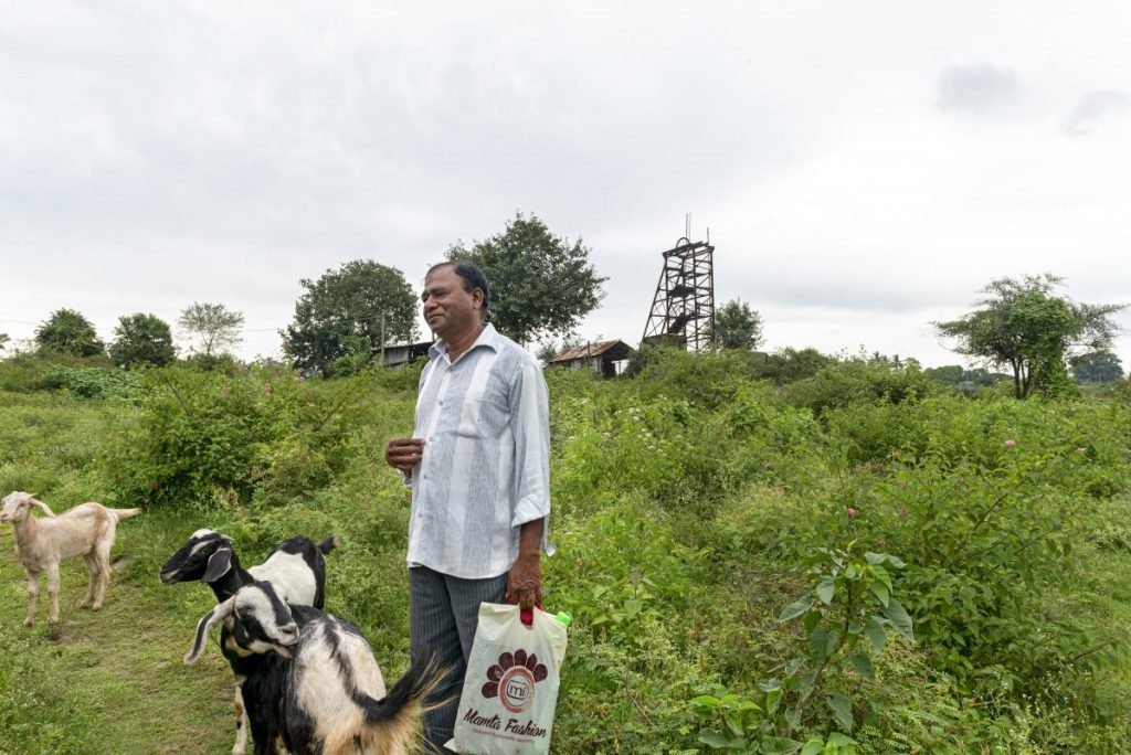 From mining labour to part time ‘shepherding’: Mohan Kumar, a former winding driver at Hancock’s and Tenant’s shaft, now tends to a small flock of goats, as do many residents of KGF. Photo: Clare Arni.