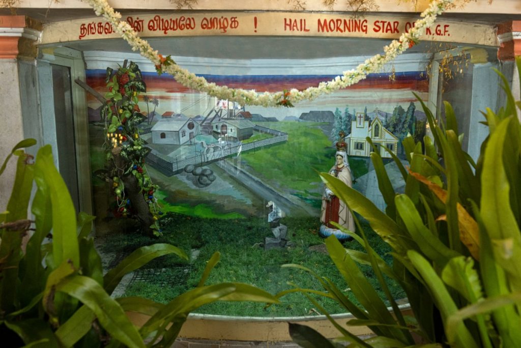 Signs of solace and healing: the ‘Mother of Mines’, whose shrine was among the oldest in KGF, now keeps a benign watch on the memory of the mines, blessing a miner in full gear, in a tableau positioned behind the main altar of the church. Photo: Clare Arni.