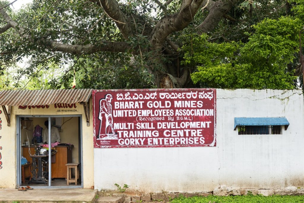 Turning an ending into a new beginning: an attempt was made by the last recognised union at the time of the closure in 2001, the Bharat Gold Mines Employee’s Union, to start up small enterprises in the area. Other kinds of activities have since taken the place of the Thangavayel Shirt Manufacturing unit, which put one of the large halls near the Oorgaum Railway Station, to new use. Photo: Clare Arni.
