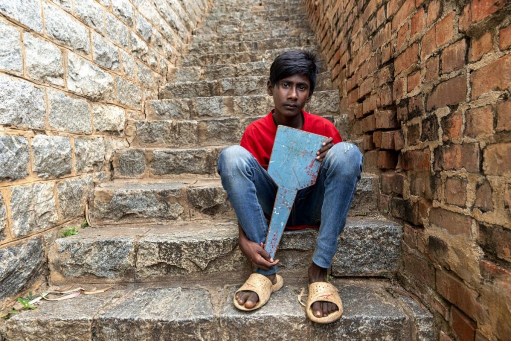 A young KGF resident poses with his KGF-made ‘kattabat’ on the steps of the Italian miners’ quarters for a wholly indigenous game that follows badminton rules and uses a ball made of twine. Photo: Clare Arni.