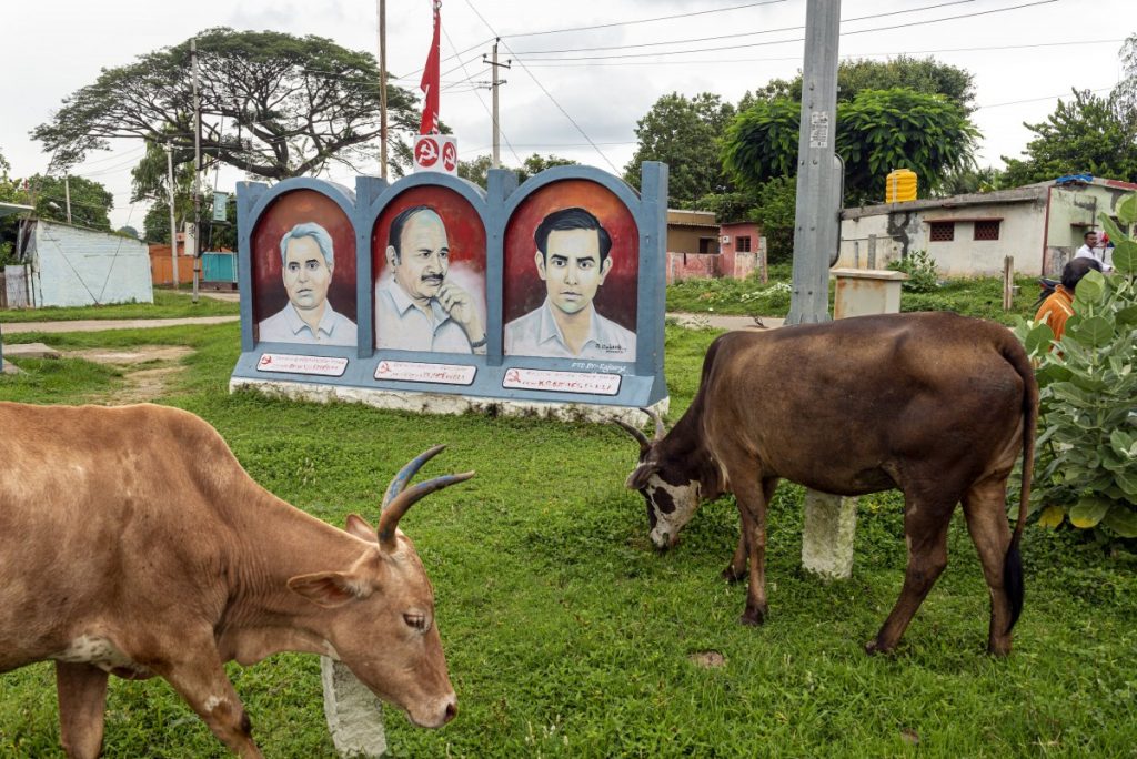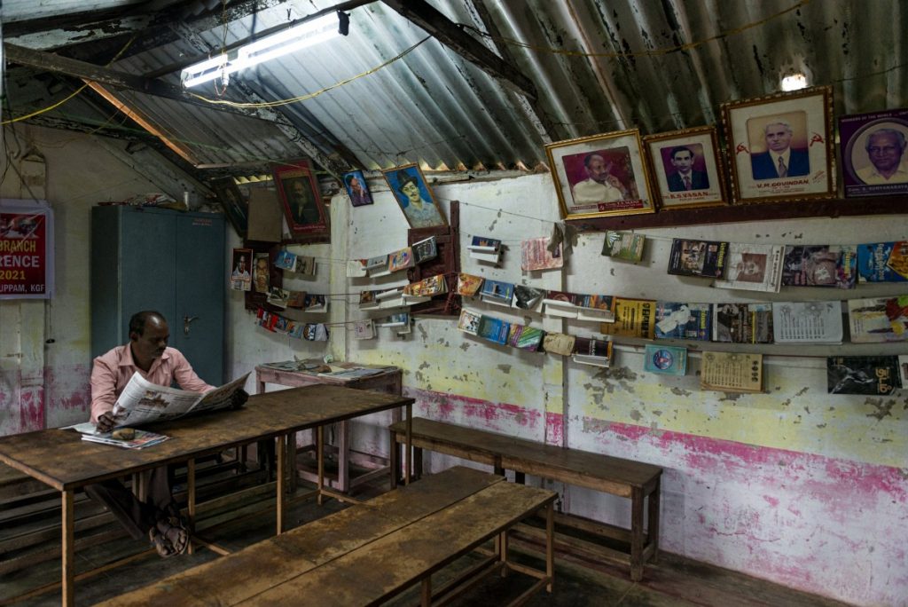 A row of six red graves, in the part of the Roger’s Camp graveyard reserved for the Reds, commemorates the men who were killed in police firing in 1946 . However, it is in the small, well-kept library, frequented by workers, that honours its early leadership not just on the walls, but in the papers and books that litter the reading tables. Vasan and Govindan have even been put in suits and ties, which they might never have worn, as a sign of workers’ pride in their leaders.