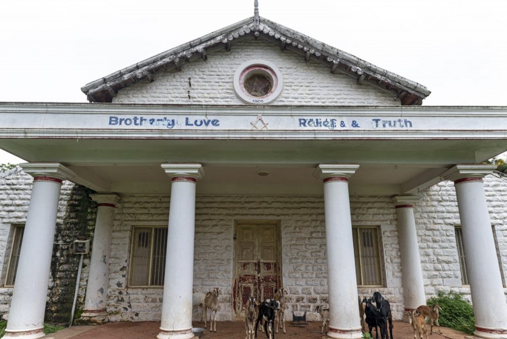 The Freemasons’ Hall, with goats tethered in the Tuscan-columned porch. Photo: Clare Arni.