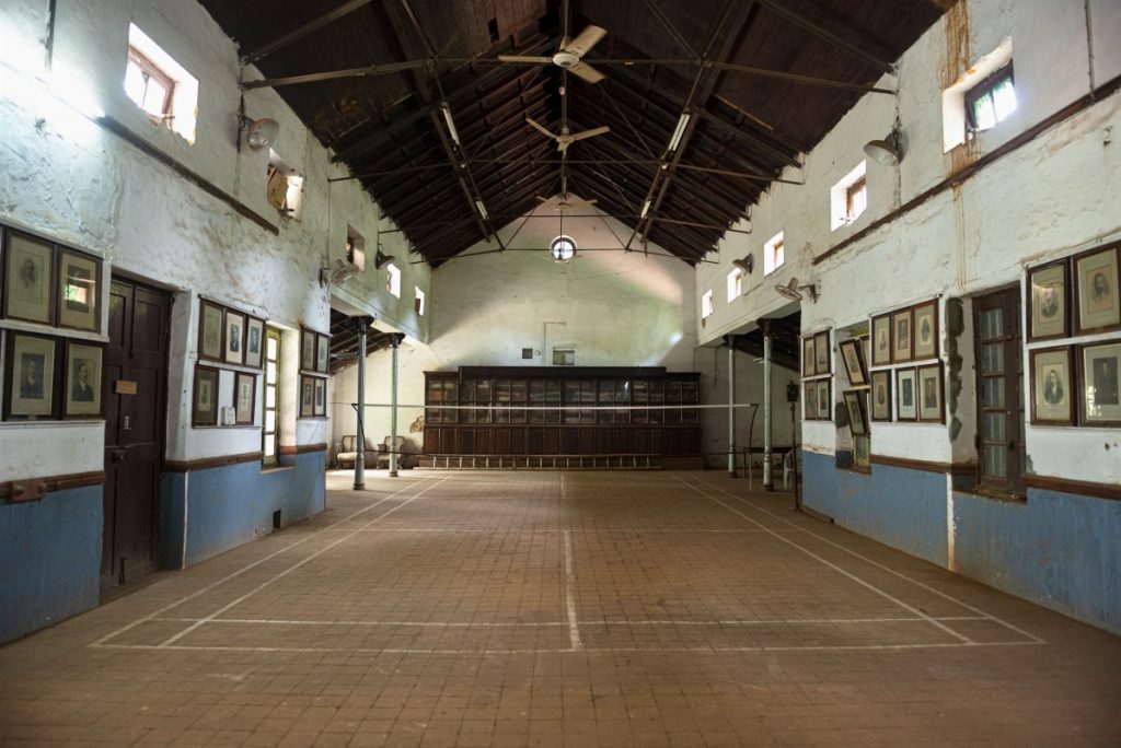 The conference hall in the clubhouse, once the meeting place of the engineers and managers who ran the profitable gold mines for nearly 80 years, now doubles as a badminton court and play space. A solid shelf of books containing mining and metallurgical journals is neglected, as is the adjoining library. Photo: Clare Arni.