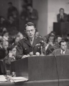 Nuremberg prosecutor Telford Taylor at one of the trials. Photo: Wikimedia Commons/OMGUS Military Tribunal. Public domain.