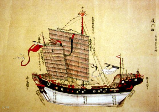 A Song dynasty junk from a 13th-century painting with the typical rectangular sails, the stern-mounted rudder, and large rectangular-shaped construction from bow to stern of the Chinese junk. Credit: Wikimedia Commons