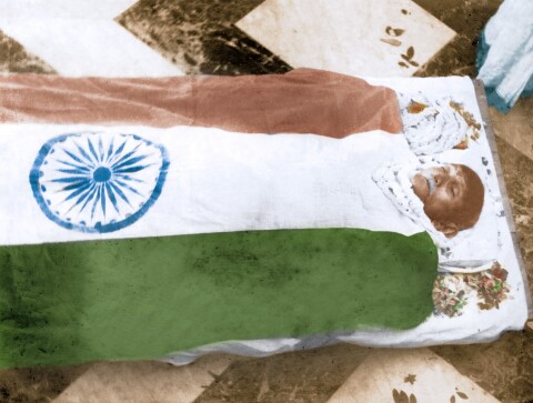 Mahatma Gandhi's body draped in the Indian flag, New Delhi, January 31, 1948. © Jayan Mitra/Dinodia Photo
