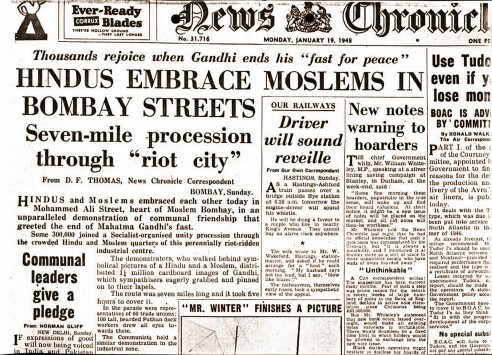 News about Hindu Muslim unity in News Chronicle newspaper, India, January 19, 1948. © Jayan Mitra/Dinodia Photo
