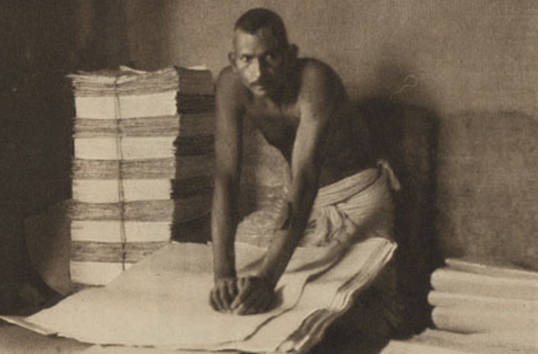 Beyond kághazi communities themselves, other groups sought to revive and protect Indian handmade papermaking in the early 20th century, especially after the rise of the swadeshi movement. Papermaking was one of several trades that Gandhi praised as a potential cottage industry that could form the basis for an autonomous Indian economy. This project was taken up most prominently by K.B. Joshi, a Pune-based scientist and member of the All-India Village Industries Association. Writing in the early 1940s, Joshi argued that “the manufacture of paper by villagers in India will not fail to revolutionise their economics.” In 1940, with the support of Gandhi, Joshi founded a Handmade Paper Institute in Pune, which sought both to protect regional paper traditions and to promote the use of new materials and practices to make handmade paper competitive on the Indian market.