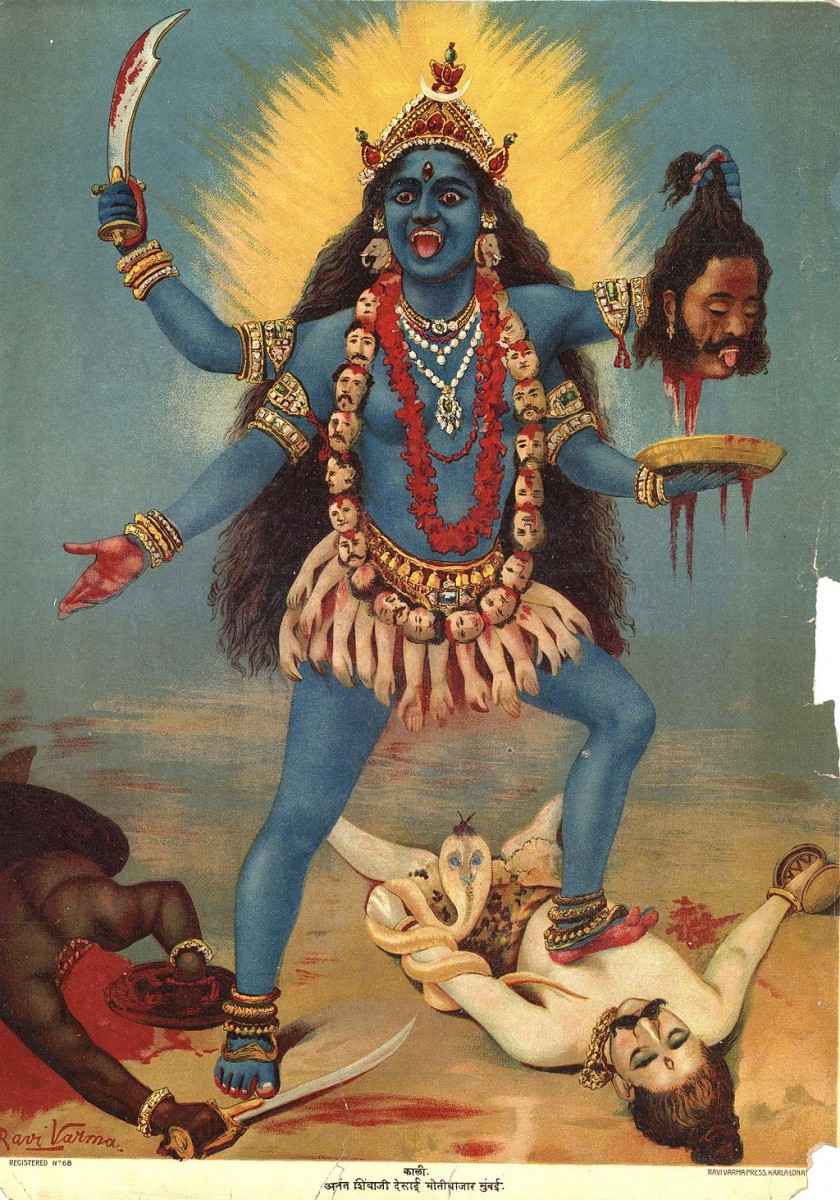 Raja Ravi Varma's painting of Kali trampling Shiva, digitally retouched. Photo: Public domain/Wikipedia