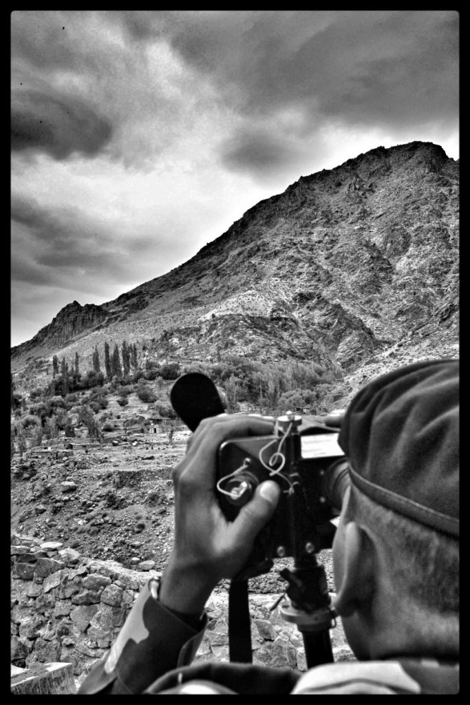 An Indian Army officer looks through a high optical instrument across the LoC in Kargil sector.