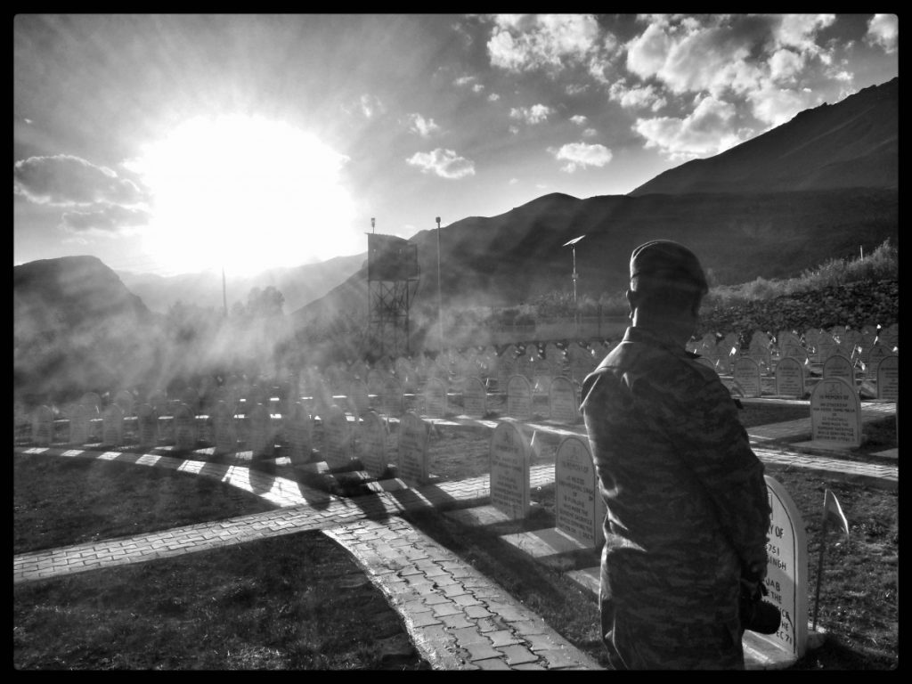 The tomb stone of the martyrs who lost their lives in the 1999 war, at the Dras memorial. Behind is the Toolong hill.