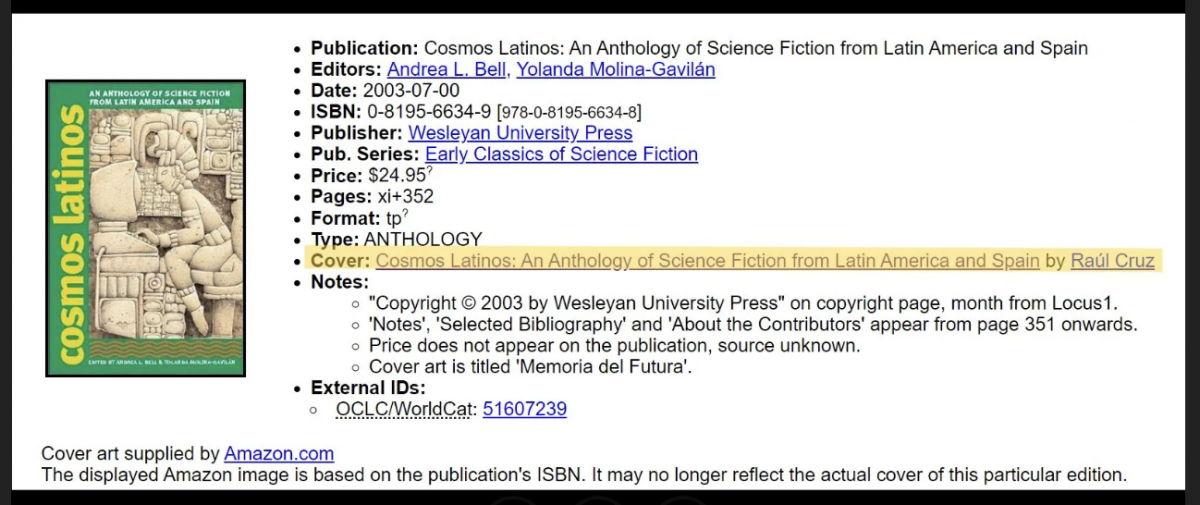 Furthermore, we found that this artwork had been used as cover art in a book named ‘Cosmos Latinos: An Anthology of Science Fiction from Latin America and Spain’. Cruz has been credited for the cover design, according to the Internet Speculative Fiction Database.