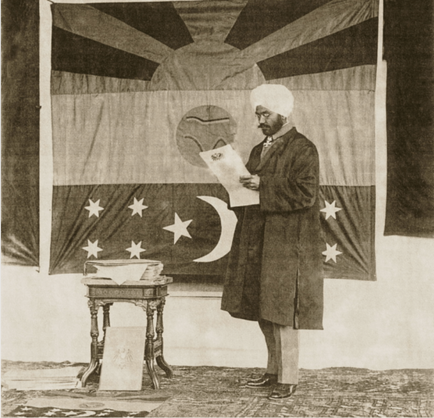 President Raja Mahendra Pratap with the flag of the Provisional Government of India.