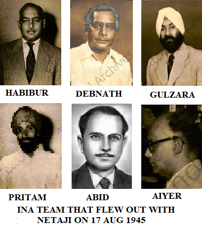 On the midnight of August 16-17, 1945, Bose collected all officers at his residence and discussed with them various plans. He chose S.A. Aiyer, Debnath Das, Colonel Habibur Rahman, Captain Gulzara Singh, Colonel Pritam Singh and Major Abid Hasan to fly out with him to a safe place. None of them were informed where they were flying to. But they presumed that they were heading for Dairen, where Netaji would explore Soviet asylum for the future struggle.