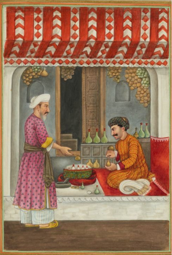 From the Ain-i Akbari, the administrative records of Akbar’s court compiled by Abul Fazl around 1590, we learn that perfumes made of rosewater and musk were sold by the bottle for Rs 1-3. Conversely, scents that were more precious and difficult to source, such as those made from ambergris, were sold in smaller quantities for far greater prices, fetching several mohars (gold coins), perhaps putting them beyond the reach of anyone but courtly elites. Because of the cost of sourcing materials, most bazaar-based artisan perfumers were likely confined to producing more accessible products, while those who produced more expensive scents were patronised directly by the court.