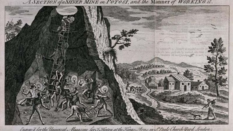 The colonisers soon began extracting the metal using a labour force of indigenous people and African slaves, who mined 100,000 tons from the 16th to 19th centuries. Silver coins and bullion were first exported to Spain, and from there to other parts of the world.