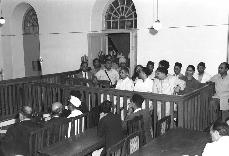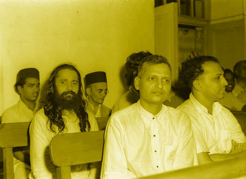 Photo taken during the trial of the persons accused of participation and complicity in Mahatma Gandhis assassination in a Special Court in Red Fort, Delhi. The trial began on May 27, 1948. V.D. Savarkar, wearing a black cap, is seated in the last row, while Nathuram Godse and Narayan Apte are up front. Credit: Photo Division, GOI