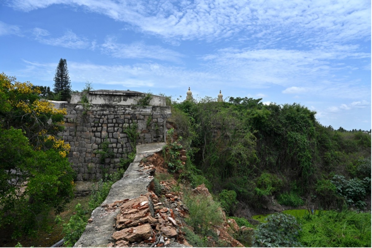 Overrun by ‘nature’ or silencing the past? The progressively ruined fort walls of the historic Srirangapatna fort, with the minarets of the Jumma Masjid on the horizon. Photo: Clare Arni