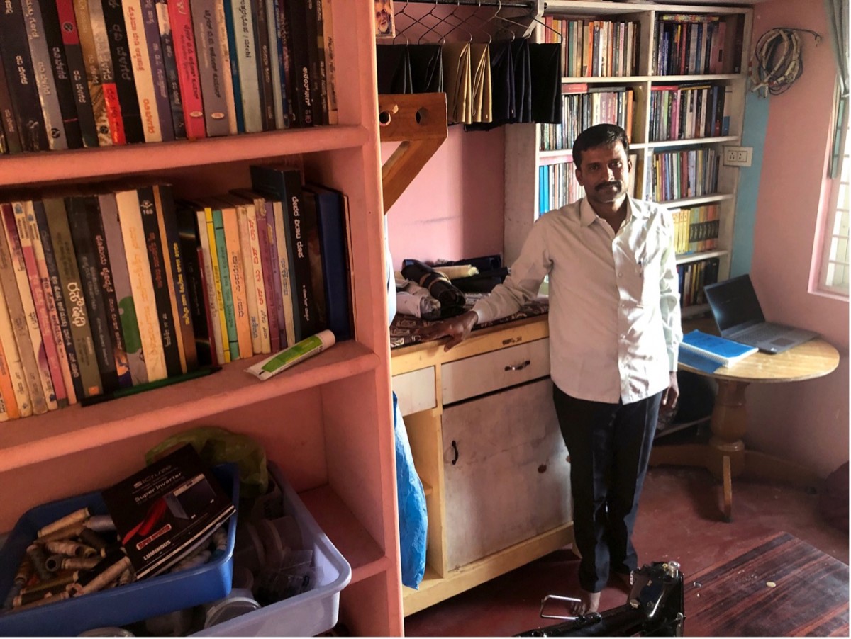 Nights of Labour: Shivakumar, who runs the Sanjaya Prakashana, in his tailoring room cum library. Photo: Clare Arni