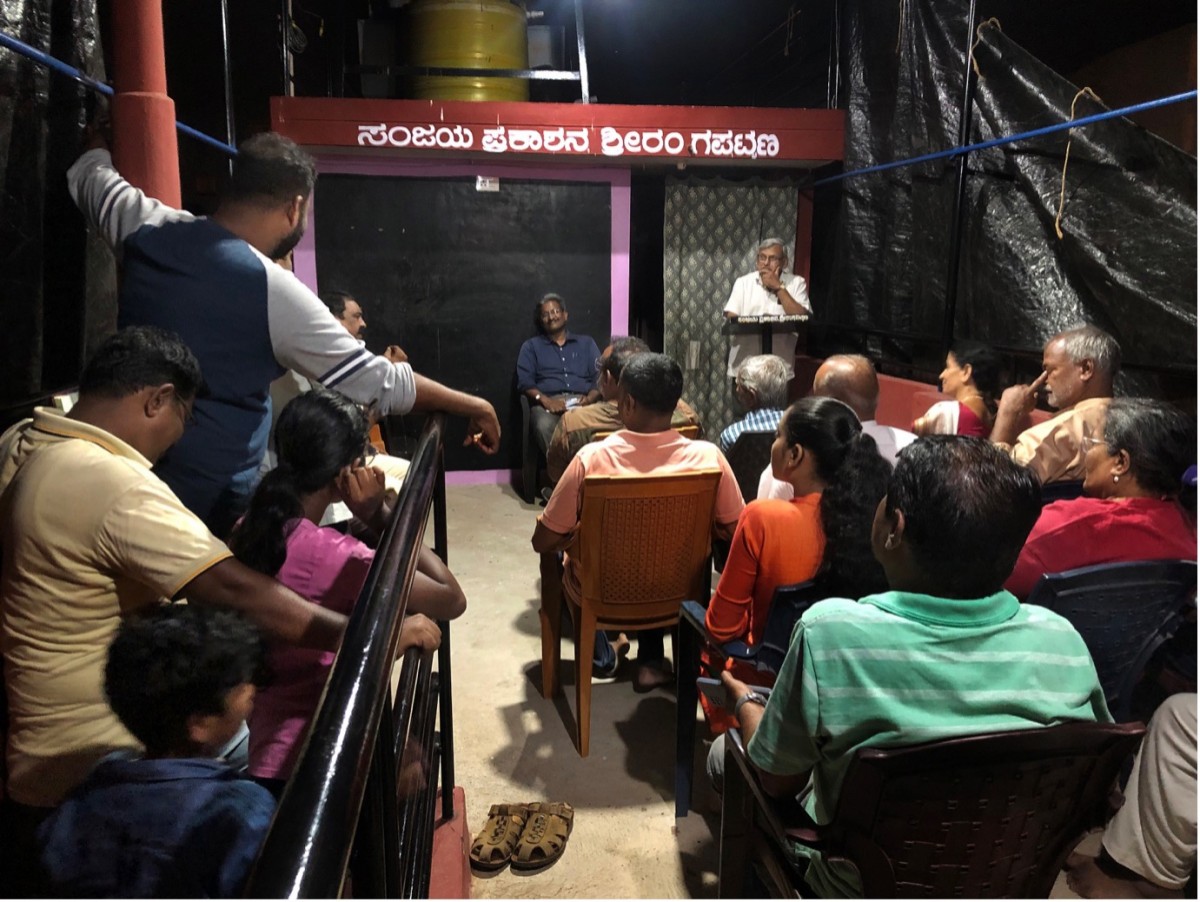 Gathering at Sanjaya Prakashana, May 3, 2023: Nidhin Olikara is seated to the right of Dr Sujaya Kumar at the podium. Photo: Clare Arni