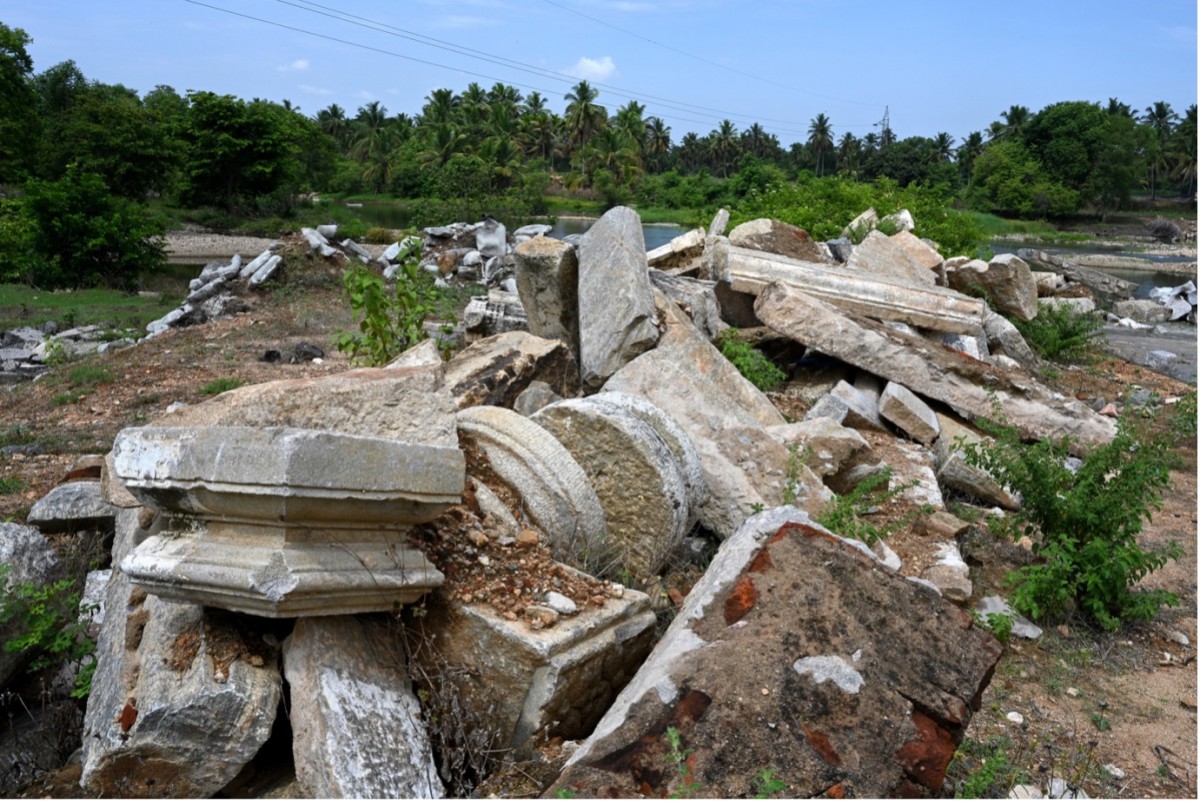 Stone inscription marking the boundary of the Esplanade at Srirangapatna, amid the ruins of the temple displaced by highway. Photo: Clare Arni