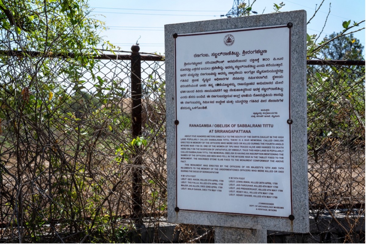 The ASI is of course not entirely without zeal, absentminded though that zeal might be. The only obelisk to which tourists are drawn is the one that commemorates the British soldiers slain in the Siege of Srirangapatna. Installed in 1907, more than a century after the British had vanquished Tipu, it eclipses the four other obelisks in Srirangapatna, all in ASI hands, and all relatively neglected. Of these, two obelisks bear the same name, ‘Ranagamba Sabbal Rani Thittu’!