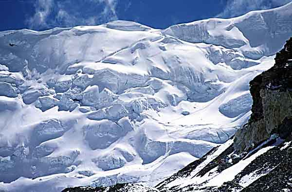 The Difficult North Col, first scaled in 1921 and seen as the start of the route to the summit. Camp IV is located on the top of the ice wall which changes every year and is prone to avalanche.