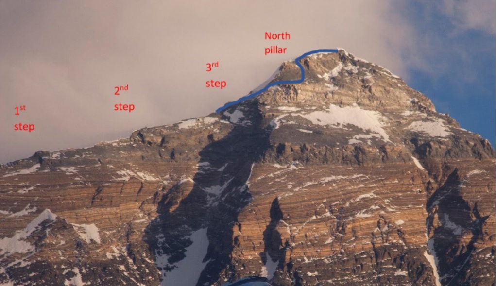 A close up view of the upper North East Ridge of Everest showing the three rock steps and Mallory’s possible solo route to the summit up the final pyramid, diverging onto the North Face and zig-zagging via the modern day “dihedral” route to the summit. If Mallory was hindered by the mid-afternoon storm, its likely though that he would have veered to the left to shelter in the lee of the final pyramid which would act as a giant windbreak, before continuing up over the apex or “North pillar” to the summit proper. Photograph courtesy of Stuart Holmes with thanks from the authors for this kind contribution.