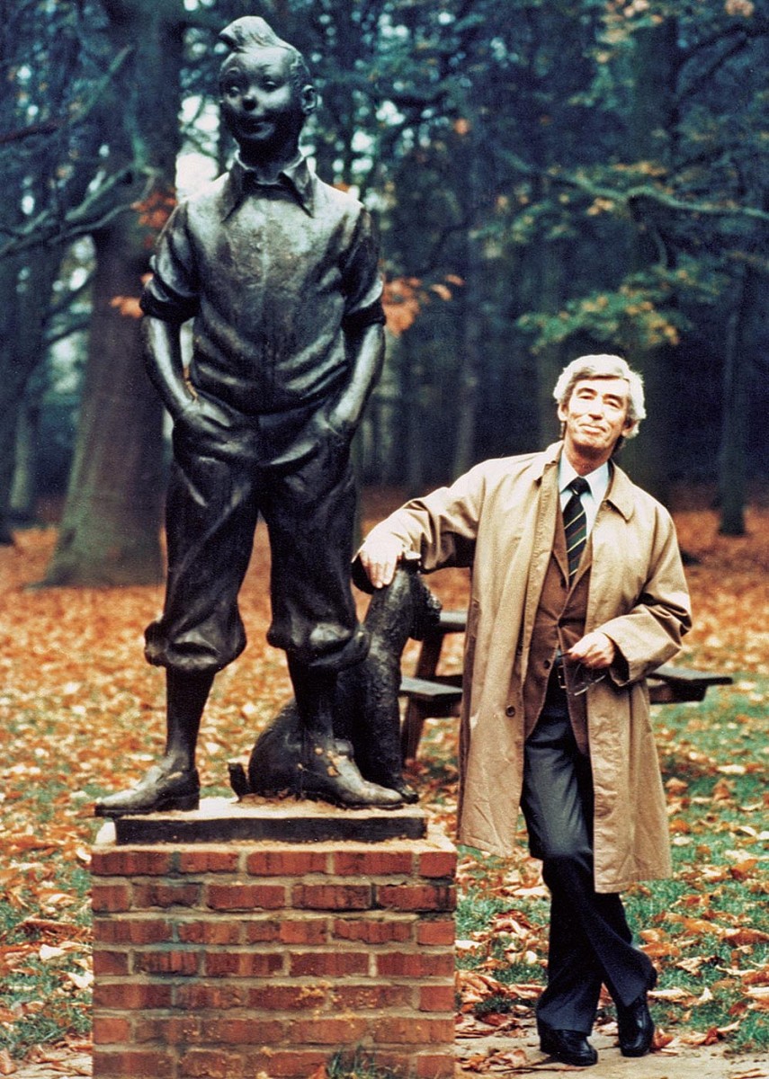 Hergé poses in 1979 next to the bronze statue of Tintin and Snowy, made by the Belgian artist Nat Neujean. Photo: Studio Hergés/www.tintin.com