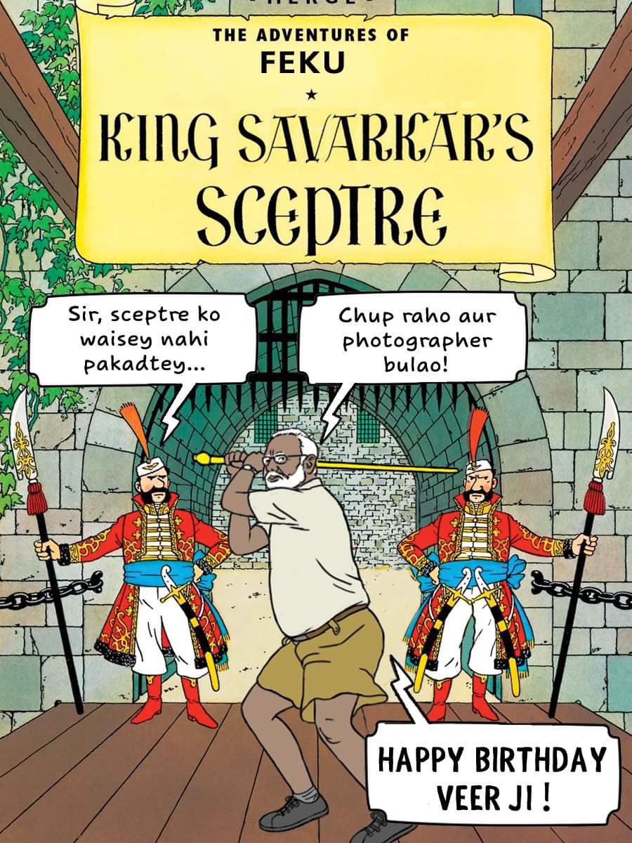 While the artists of these versions are anonymous, around the time of the inauguration of the new parliament building in May 2023, another Tintin adaption, appeared on social media – King Savarkar’s Sceptre. This one was drawn by graphic artist Orijit Sen. The depiction of an easily recognisable man in RSS uniform swinging a sceptre around provided some comic relief around the much hyped and controversial Sengol.