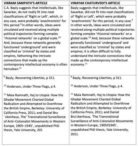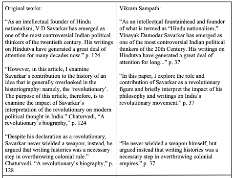 Drawing comparison between Sampath’s first volume of the biography of Savarkar and Paul Schaffel’s thesis submitted to Wesleyan University in 2012, the three historians cite the following paragraphs from both the works that are quite similar.