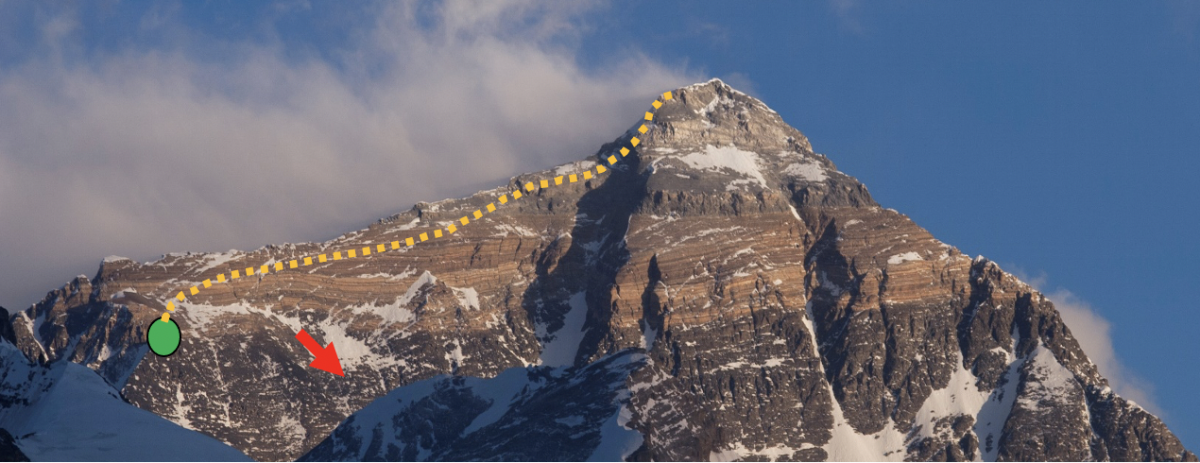 The impressive North face of Everest, with the dashed line marking the likely route of Mallory and Irvine climbing "skyline" on the North East Ridge. Note the location of the 1924 Camp VI at 8140 metres (green dot) and also Mallory's found location of 8155m (red arrow). The yellow dot indicates the likely location for Irvine, based on previous glimpse and projecting upwards from Mallory's location with the still attached rope with force marks caused by Irvine's belaying on the rope. Photograph courtesy of Stuart Holmes with sincere thanks from the authors.