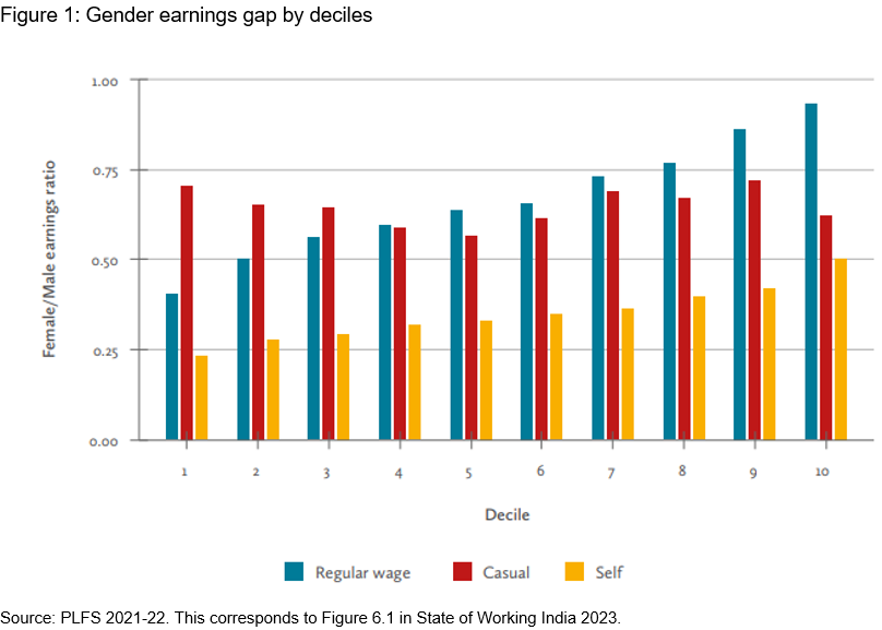 Selected findings from the State of Working India Report 2023 focus on the implications of this fact on women’s earnings and the gender-based earnings gap using evidence from official employment surveys.