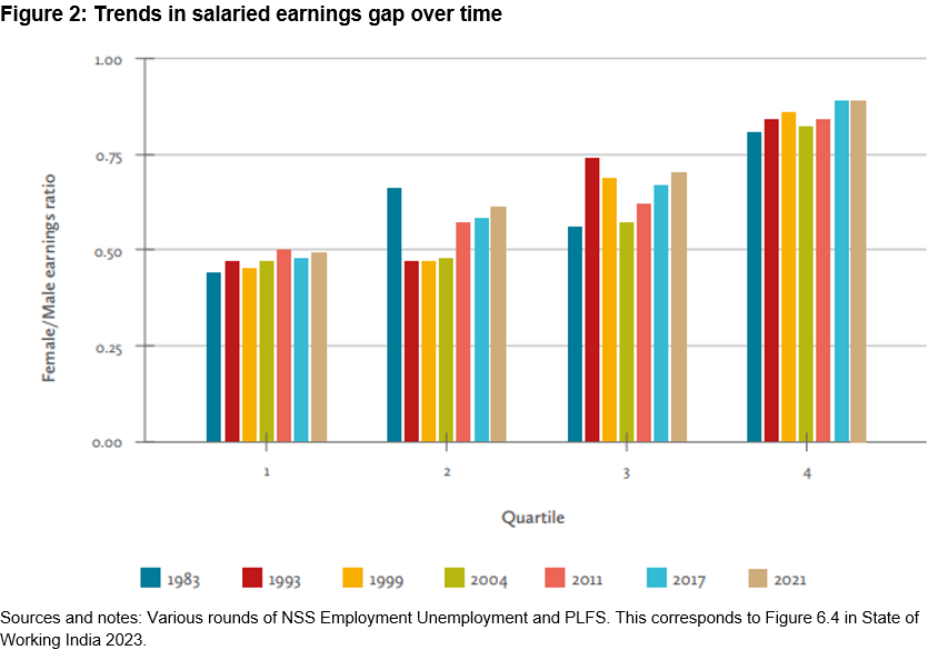 One, gender-based discrimination in the labour market may have decreased over time, with employers treating men and women similarly. Or it could be that the very nature of women participating in the labour market (vis-a-vis men) has changed, with more educational attainment among women as well as an improvement in the kinds of occupations and industries they had access to within regular salaried employment.