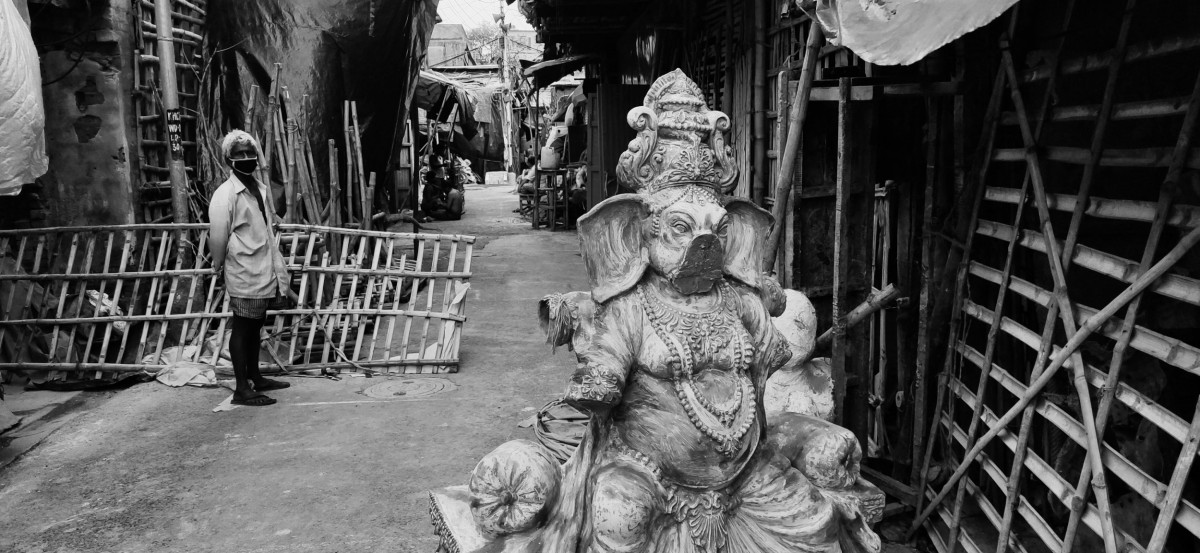Some of the studios had been closed before the cyclone hit; their owners had left for their villages when lockdown was announced. Their unfinished handiwork – straw figurines on bamboo skeletons – are piled up in front of padlocked doors.
