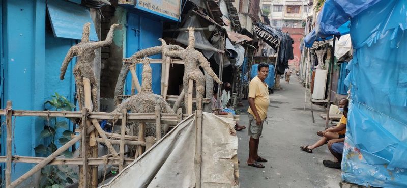 Kolkata: The broken tin roof of a two-storey studio rattles precariously in the strong wind, threatening to fall at any moment into the narrow alley in Kumartuli, the hub of idol-making workshops in Kolkata. There are many such damaged roofs in the area; only their bamboo skeletons stretch up to the sky.