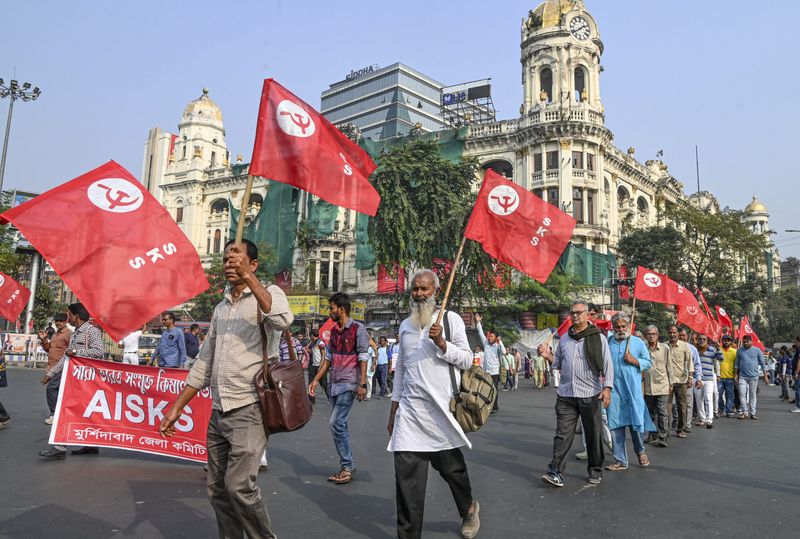 Members of various trade unions take part in a protest rally during a 24-hour nationwide general strike called by trade unions against the central government's alleged anti-labour policies, in Ahmedabad, Wednesday, July 9, 2025.