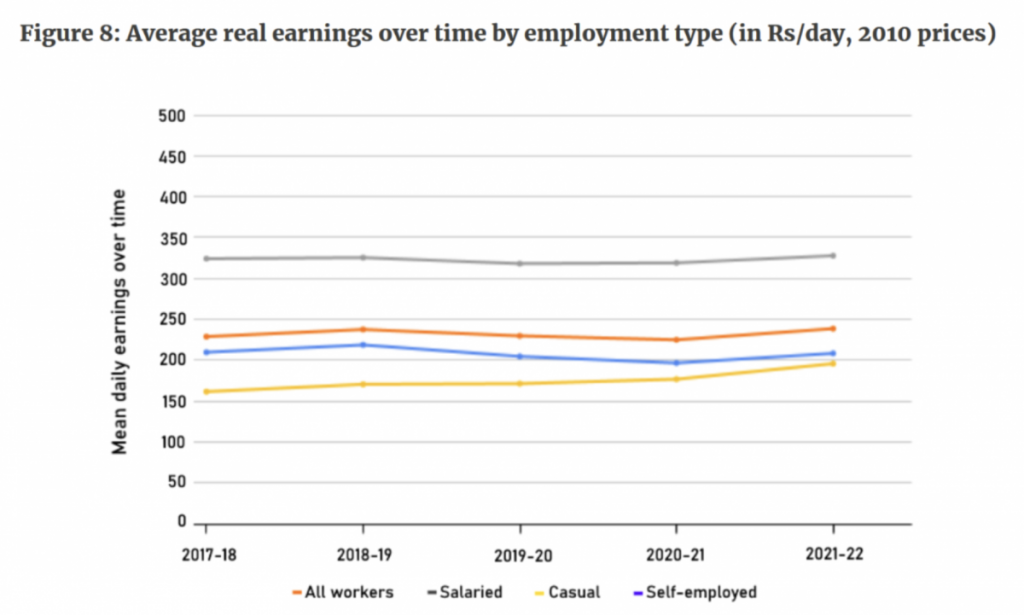 According to PLFS data (2017-22) quoted by the economists, real wages have been stagnant for the salaried class and the self-employed as well.