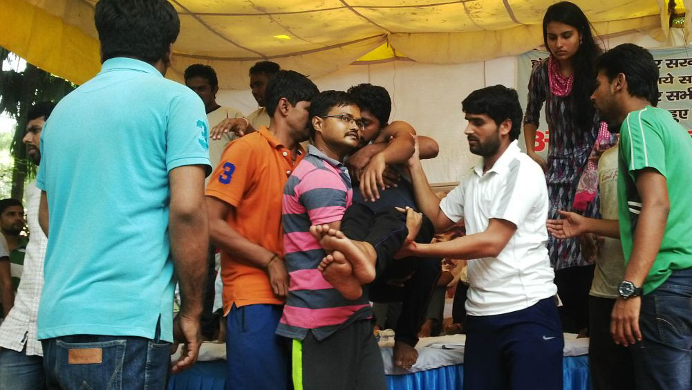 Vipin Paul, being carried by his colleagues, after fainting from exhaustion and dehydration on the eighth day of his fast. Credit: Special arrangement