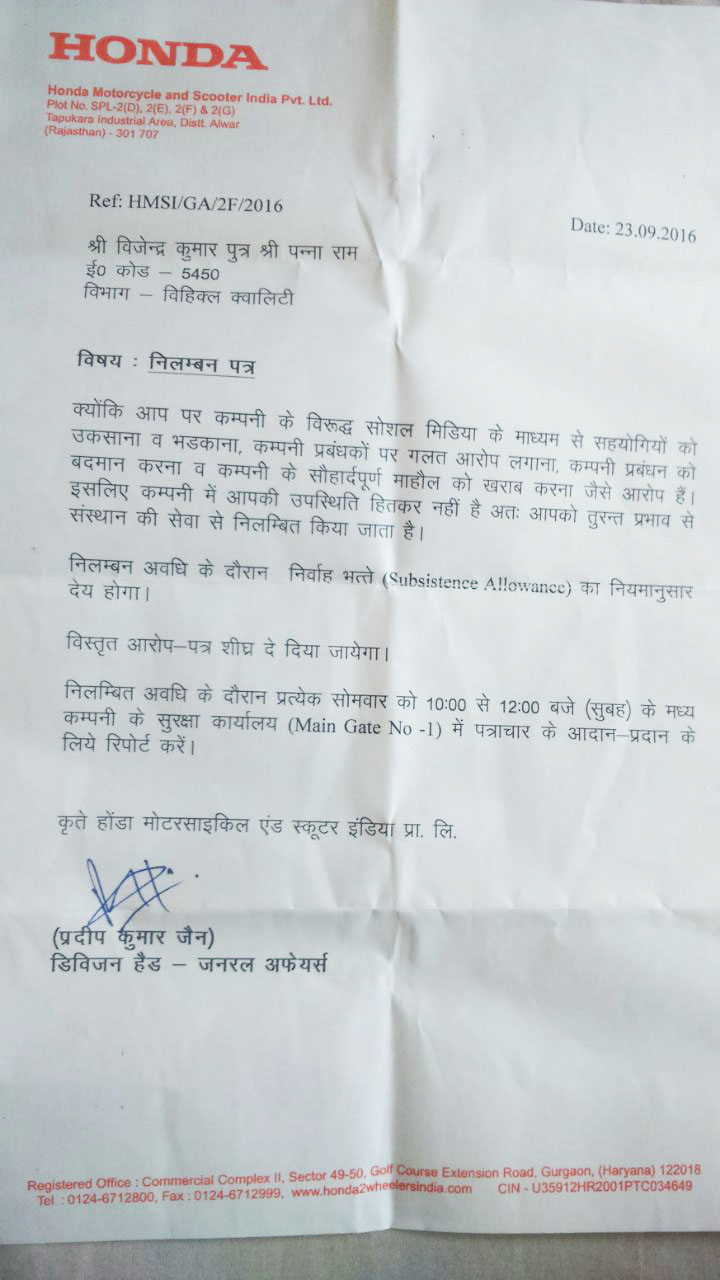 Suspension letter given to Vijender Kumar at the Honda Tapukara plant. Credit: Special arrangement