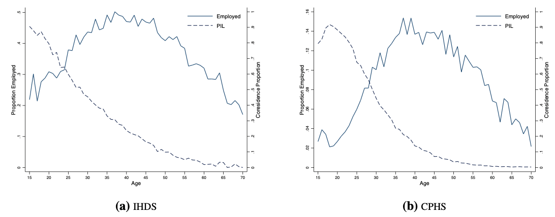 Figure 1 shows that these two phenomena are negatively correlated over the lifecycle: in both the Indian Human Development Survey (IHDS, 2005 and 2011) and the Consumer Pyramids Household Survey (CPHS, 2016-2019), employment among married women follows an inverted U-shaped pattern, rising until a woman reaches her forties and declining thereafter.