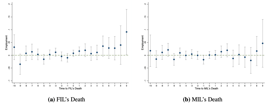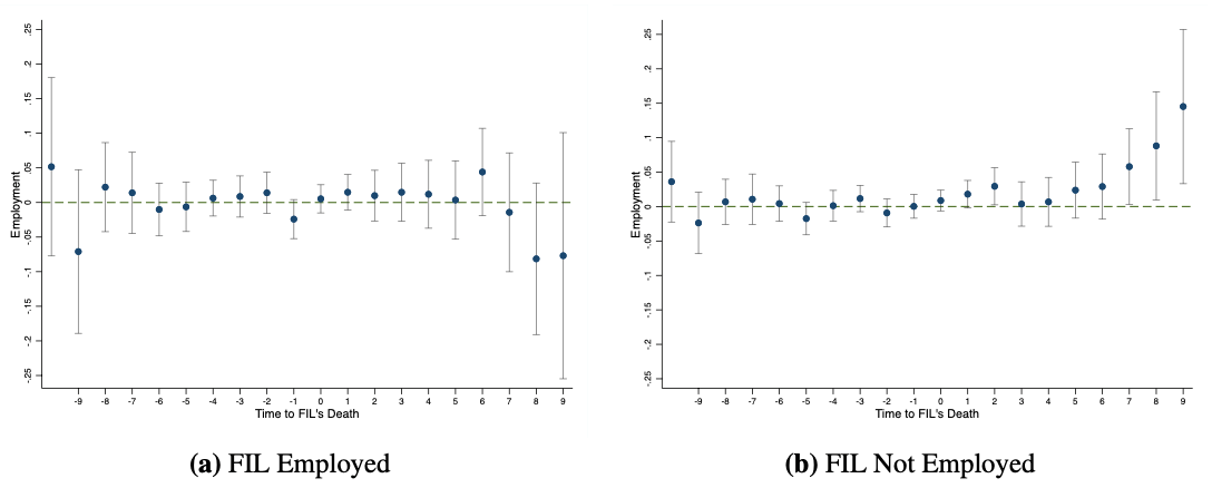 Note: The y-axis denotes changes in employment rate relative to the year before the event of a FIL’s death, with 95% confidence intervals for the point estimates.