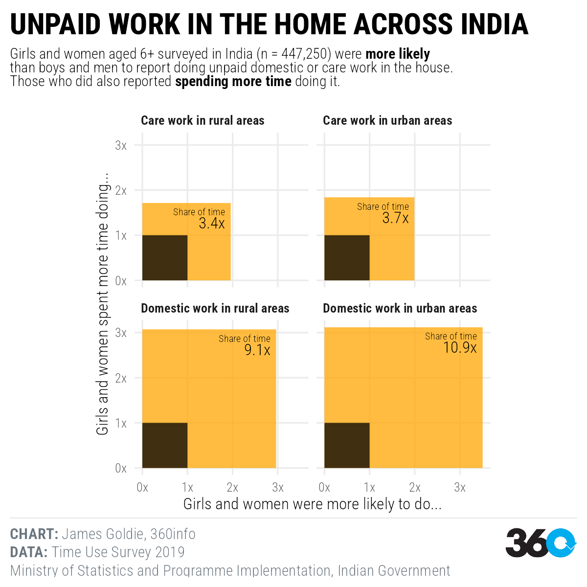 A pre-pandemic survey of time use in India showed that in both urban and rural areas, girls and women aged 6+ were several times more likely than boys and men to do care work and especially domestic work — and the ones who did spend several times as long doing it.