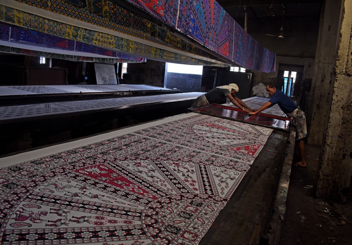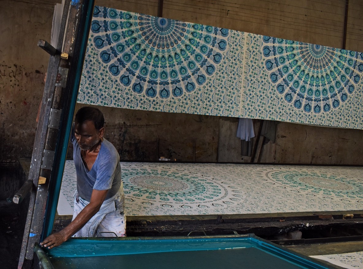 Men engaged in screen printing patterns in Sanganer, Rajasthan. Photo: Jignesh Mistry