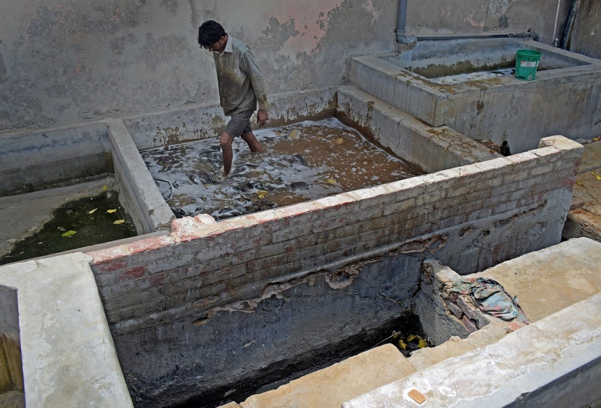 A Dhobi (washerman), washing printed fabric in a tank in Bagru, Rajasthan. Photo: Jignesh Mistry.