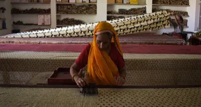 A woman prints on fabric using a hand block at a workshop in Bagru, Rajasthan. Photo: Jignesh Mistry.