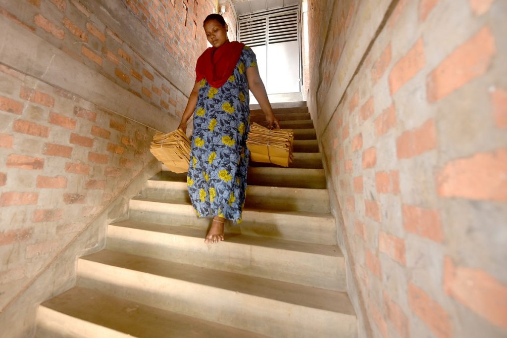 Kala Malliga walks with her handmade paper bags to deliver them at Thiruvananthapuram, India, February 24, 2021. Malliga took up work for the first time after her husband lost his salesman’s job at the local market declared a COVID hotspot. Her earnings have made her “feel like an equal” at home but she hoped her husband finds work in the Gulf some day. Photo: Thomson Reuters Foundation/Rakesh Nair