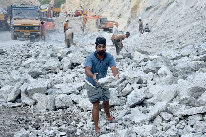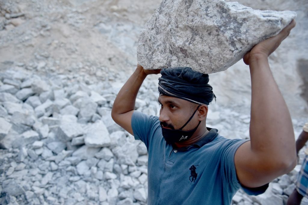 Sharif Khan lifts stones at a quarry in Yeroor village, India, February 17, 2021. Khan worked at a mall in Qatar but returned to his village jobless last year during the pandemic. He starts from home at 5 am every day to beat the rush of people seeking work at the stone quarry. Photo: Thomson Reuters Foundation/Rakesh Nair